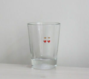 Wasserglas, kleines schweres Tafelglas liebevoller Gravur in rot und Gold: Doppelherz mit Krone. Ein sehr schönes Hochzeitsgeschenk. Dieses Symbol passt für alle liebenden Paare